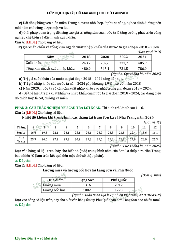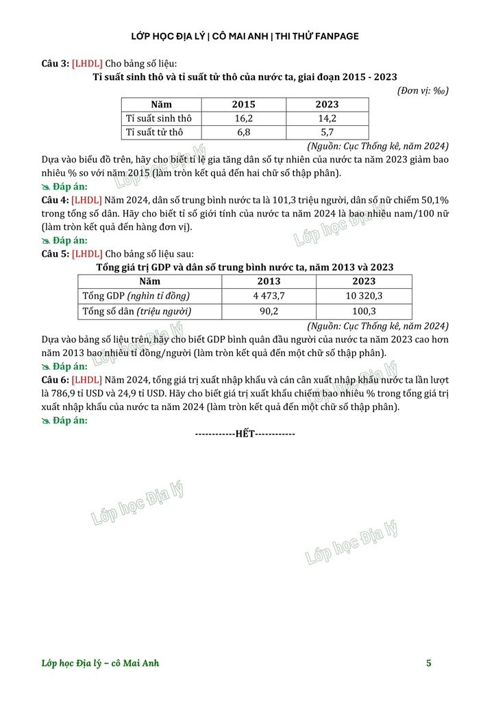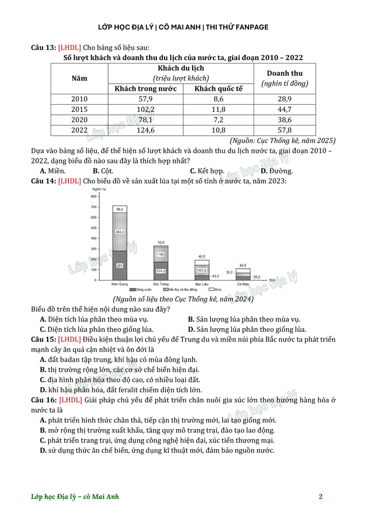 Lớp học Địa lý - Chiến dịch "10 Điểm giữa kỳ cùng cô Mai Anh" | Đề số 2► Link file đề: TẠI ĐÂY► Video chữa đề 2:Phần 1: Phần 2: Chúc các em học tốt nhé^^