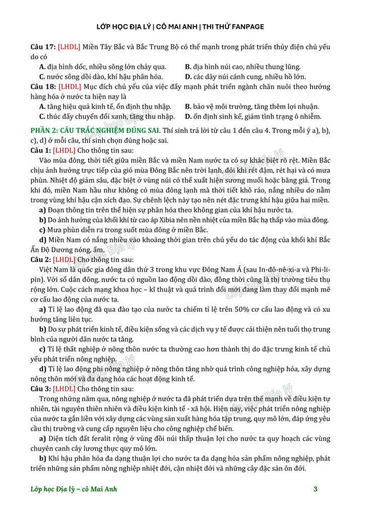 Lớp học Địa lý - Chiến dịch "10 Điểm giữa kỳ cùng cô Mai Anh" | Đề số 3► Link file đề: TẠI ĐÂY► Video chữa đề 3:Phần 1: Phần 2: Chúc các em học tốt nhé^^