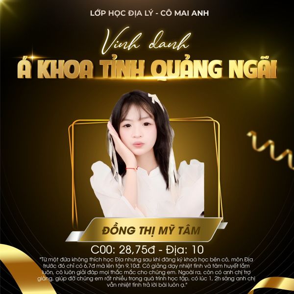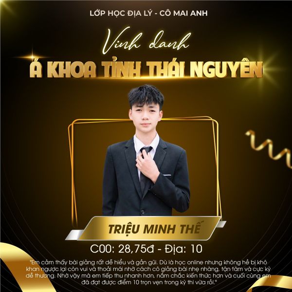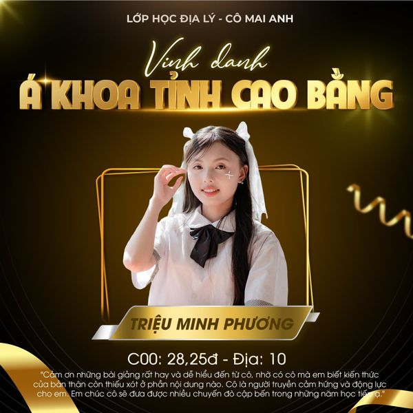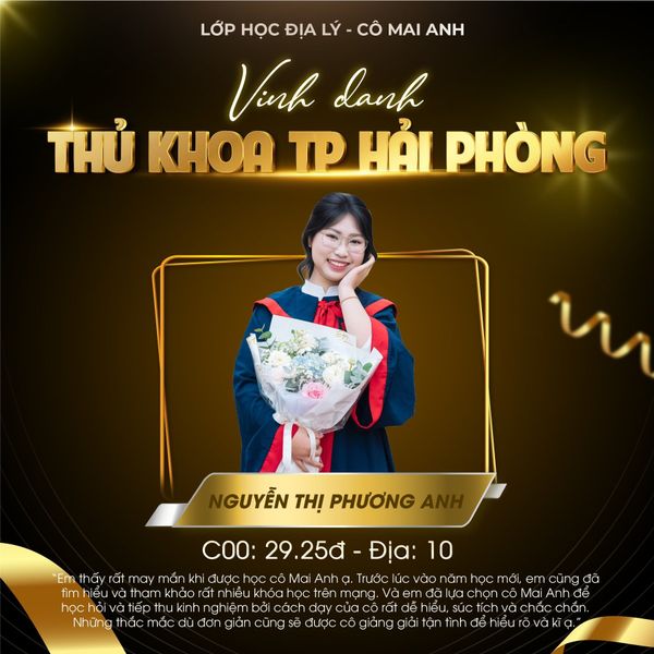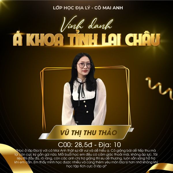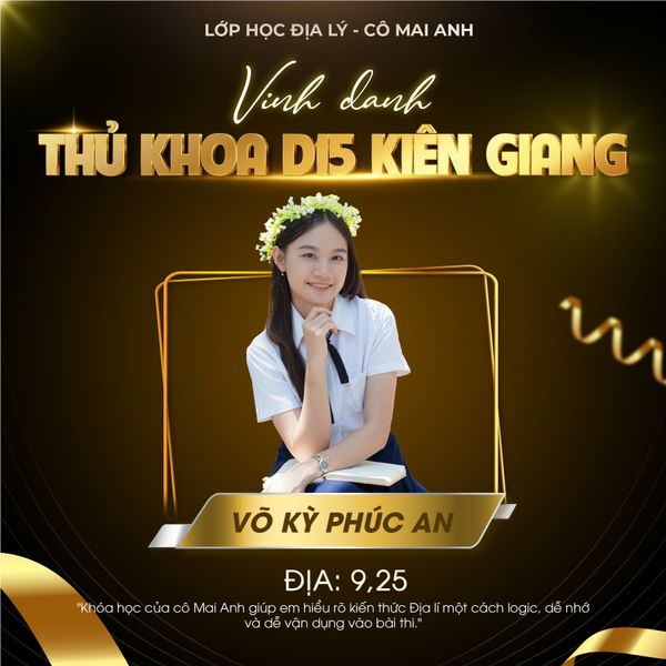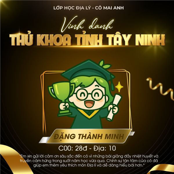 Một lần nữa, xin chúc mừng các em. Tập thể Lớp học Địa lý – cô Mai Anh rất vui và tự hào vì được đồng hành cùng các em trong hành trình đầy ý nghĩa này. Mong rằng những thành tích hôm nay sẽ là nền tảng vững chắc để các em tiếp tục tỏa sáng ở chặng đường phía trước ![]()